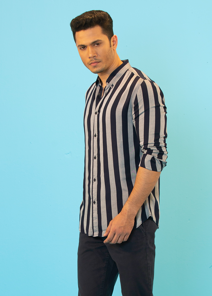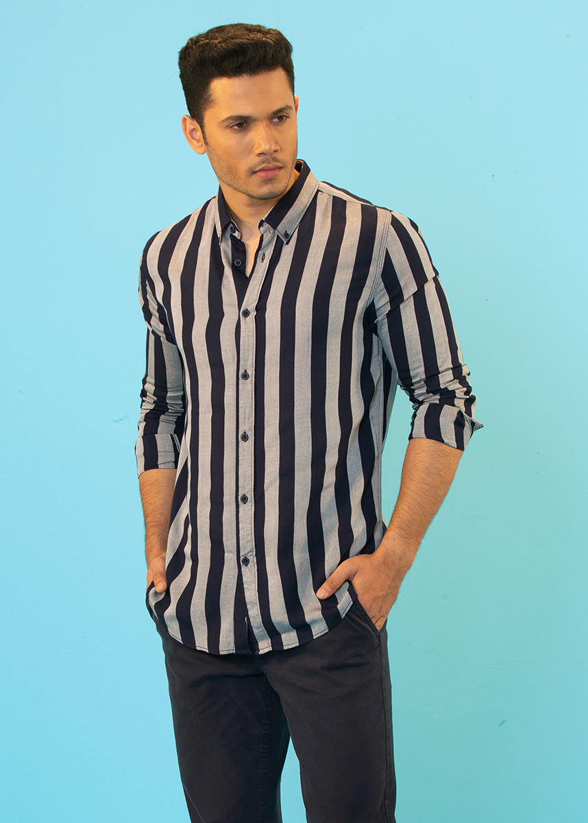 Grey casual shirt with black cabana stripes made of cotton fabric. Featuring a button down collar, long sleeves with buttoned cuffs. Pair this shirt with denim or trousers and shoes to seal your look.